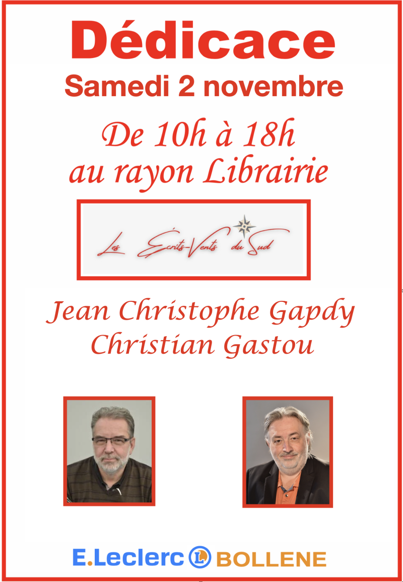 Jean Christophe Gapdy et Christian Gastou seront présents samedi 2 novembre pour rencontrer les clients de la librairie du Leclerc de Bollène et dédicacer leurs ouvrages...