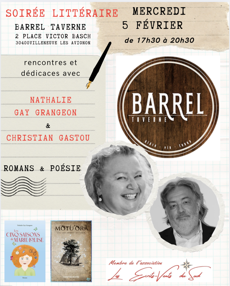 Mercredi 5 février, la taverne du Barrel accueillera Nathalie Gay Grangeon et Christian Gastou, pour une soirée littéraire. Vous pourrez les retrouver dans la très belle salle voûtée du restaurant à partir de 17h30 pour discuter littérature et découvrir leurs livres.